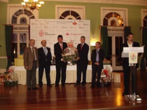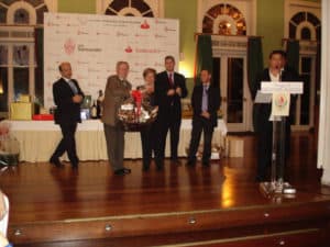 Seguidamente, el presidente del club José R. Castanedo hizo entrega al BANCO SANTANDER, representado por el Dtor. General de los RRHH del Grupo Santander José L. Gómez Alciturri de la «distinción» representativa del Club Bansander, por el apoyo que este recibe.