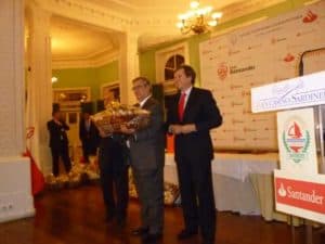 Seguidamente, el presidente del club José R. Castanedo y Carlos Hazas hicieron entrega a la Fundación Marcelino Botín, representada por la Subdirectora de la Fundación Dª Esperanza Botella de la «distinción de honor» representativa del Club Bansander.