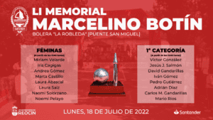 El próximo lunes, 18 de julio, se disputará en la bolera «La Robleda» de Puente San Miguel una nueva edición del tradicional concurso Memorial Marcelino Ortiz Tercilla. Como ya sucedió eel año pasado en cincuenta aniversario, también serán protagonistas las féminas que empezarán por la mañana, a paritr de las 11 horas, los cuartos de final. Las jugadoras clasificadas son: Miriam Velarde (campeona 2021), Iris Cagigas, Andrea Gómez, Marta Castillo, Laura Abascal, Laura Saiz, Naomi Solórzano y Noemí Pelayo. Las dos jugadoras que más bolos derriben jugarán la final por la tarde antes de la masculina prevista para las 18:15 horas.