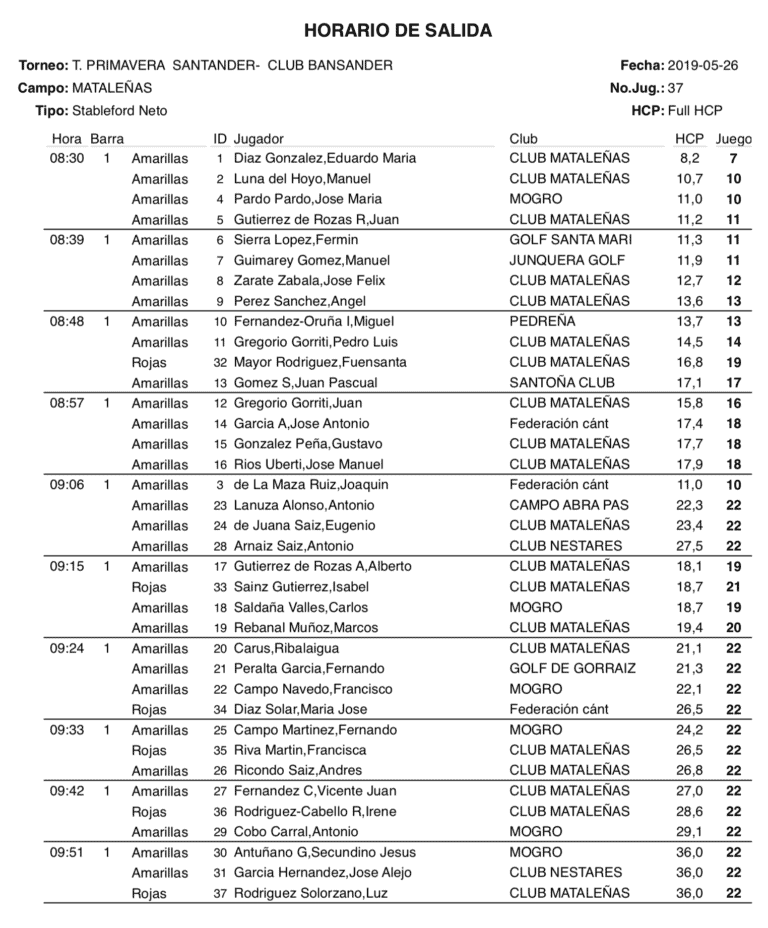 Este próximo domingo, 26 de mayo, se celebra en el Campo Municipal de Mataleñas una nueva edición del Torneo de Golf de Primavera del Club Bansander. Una vez cerrado el plazo de inscripción, el horario de salidas es el siguiente: