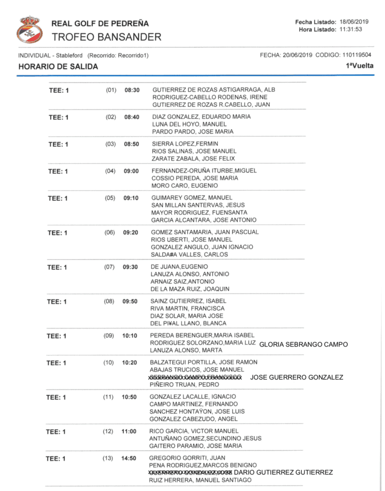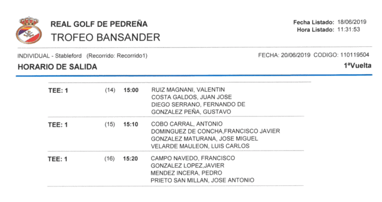 Este jueves, 20 de junio, se jugará en el campo del Real Golf de Pedreña, el Torneo de Golf- Semana Bansander 2019, integrado en los 50 Juegos Deportivos-Culturales. Una vez cerrado el plazo de inscripción, el horario de salidas es el siguiente: Golf