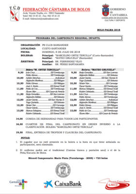 Este domingo, 8 de julio, se disputa en las boleras «Marcelino Ortiz Tercilla» y «Mateo Grijuela» de Santander el Campeonato Regional Infantil desde las 9:00 de la mañana y cuenta con la organización de la P.B. Club Bansander y la colaboración de la P.B. Peñacastillo.