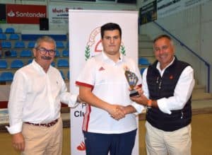 Por ultimo, la PB Club Bansander quiere aprovechar esta final del social para rendir un pequeño homenaje a uno de los nuestros. Seguramente todos estéis pensando en la misma persona, nuestro querido Vicente Torre. Pero no, aunque cualquier homenaje para Vicente se quedaría corto, en un día como hoy debemos ser justos con él. Y digo justos porque él nunca quiso ser protagonista de nada, aunque seguramente lo mereciera. Y como muchos o todos le recordamos por su trabajo con la base, con la cantera, hoy queremos rendir homenaje a Néstor. Vicente siempre dijo que serías un gran jugador y, aunque eso está por ver, llevas el camino correcto. Vicente dijo que pronto serías campeón, y este año conseguiste tu primer campeonato regional. Pero no era suficiente, también lograste ser campeón de España batiendo un récord de hacía más de 20 años, toda una hazaña. Por último, Vicente también dijo que algún día jugarías en el Club Bansander, y de momento, aunque como pinche, ya vistes esa camiseta. Ojalá dentro de no mucho podamos decir una vez más eso que tanto nos costaba decir cuando nos arrugaba el bigote, eso de Vicente tenía razón. Es por eso que hoy, siendo fieles a lo que él nos enseñó, te hacemos entrega de una placa conmemorativa de tus éxitos en esta temporada, además de un recuerdo de tu primer triunfo en un Campeonato de España. Hacen entrega de ello Eugenio De Juana y Adrián Hoyos, presidente y secretario de la PB Club Bansander. Pero además, y prometo que con esto acabo, todos los que amamos este deporte sabemos que detrás de un Campeón hay una familia que sufre tanto o más, seguramente más, que el propio Campeón, y es por eso que está Peña quiere tener un detalle con la familia en recuerdo de su gran temporada.