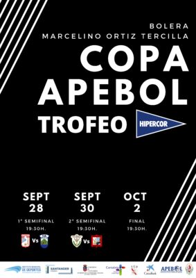 La primera competición en disputarse será la Copa Apebol Trofeo Hipercor, que tras suspenderse en marzo las Jornadas Bolísticas El Corte Inglés debido al coronavirus, se retoma disputándose las semifinales y la final. Por eso, el lunes jugarán la primera semifinal entre P.B. El Pendo Bahía Real y la P.B. Peñacastillo Anievas Mayba. La segunda semifinal la disputarán la P.B. Hnos. Borbolla Villa de Noja frente a la P.B. Comillas el próximo miércoles. Los ganadores de ambas semifinales serán los que jueguen la final que se disputará el viernes. Todos los partidos comenzarán a las 19:30 horas.
