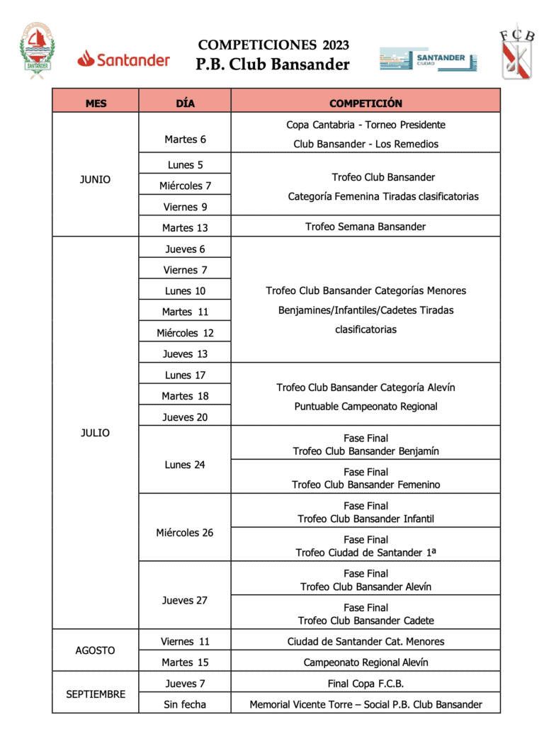 Os dejamos el calendario previsto donde ya esta semana tenemos las tiradas clasificatorias del Trofeo Club Bansander para categoría femenina y el partido de la Copa Presidente.