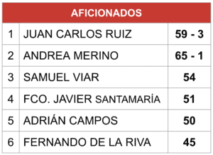 Comenzaron los seis jugadores clasificados de la categoría aficionados donde Andrea Merino con 65 bolos y Juan Carlos Ruiz con 59 bolos consiguieron una plaza para jugar la final a juego libre a tres chicos, donde consiguió la victoria por 3-1 Juan Carlos Ruiz.