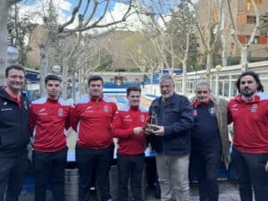 Tras la final, el secretario de la peña, Adrián Hoyos, hizo entrega de un obsequio a modo de agradecimiento a Alfonso Azpiazu, presidente de la P.B. Madrieña.