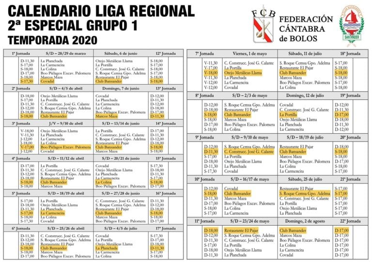 La Federación Cántabra de Bolos ha publicado los calendarios de todas las categorías, por lo que ya tenemos nuestro calendario de loiga para la temporada 2020, donde jugaremos, como estaba previsto, en el grupo 1 de la Liga Regional de 2ª Especial. En total 12 equipos Comenzaremos fuera de casa, visitando a la P.B. Covadal…
